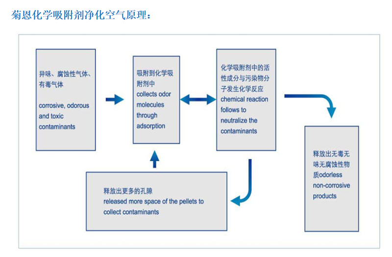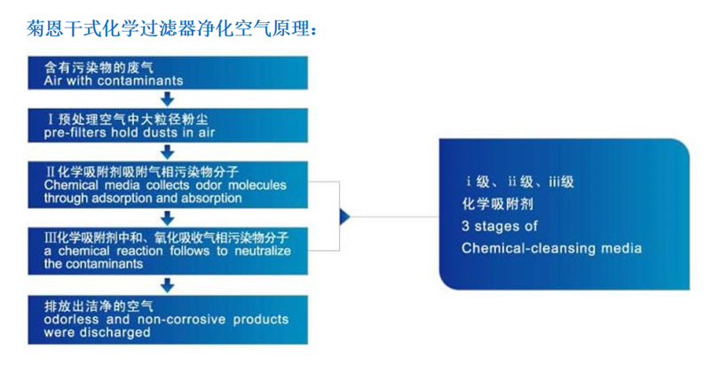 化學過濾器,以常溫常壓下,干式化學吸附與化學吸收氧化為核心技術,采用多級物理過濾聯(lián)合多級化學氧化吸收,首先預處理空氣中的粉塵,再通過不同性能的化學吸附劑多級聯(lián)合,有選擇性的將空氣中的氣態(tài)污染物質吸附到吸附劑孔隙中,繼而與負載于吸附劑中的活性物質發(fā)生常溫、持續(xù)、而且不可逆的化學吸收和氧化反應,氣態(tài)污染物質被不間斷地中和、分解、氧化為無機鹽、H2O、CO2等無害物質,釋放出潔凈的空氣。